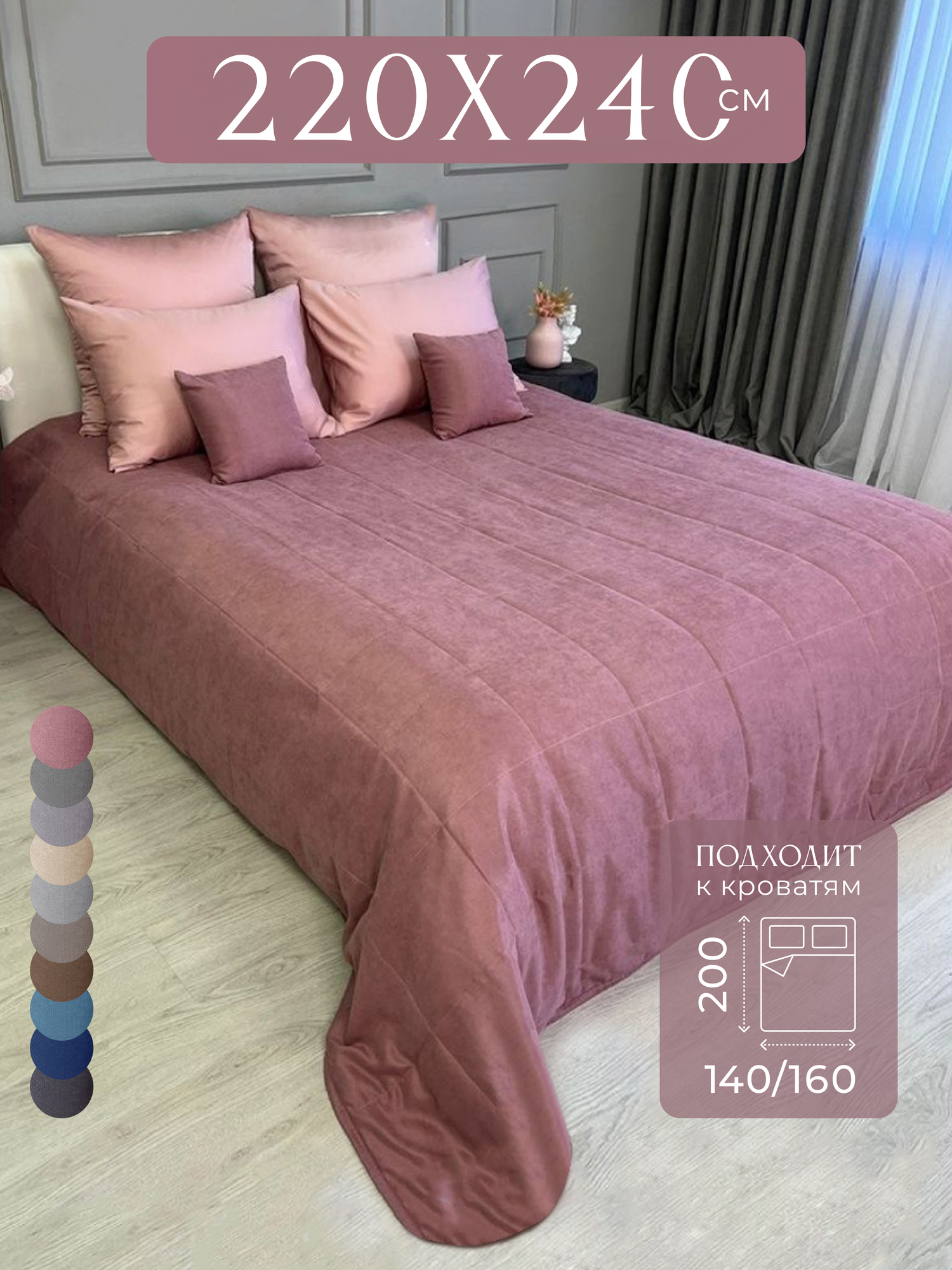 Покрывало на кровать 240х260 см с наволочками велюр MAXI ADRIA SMOKE