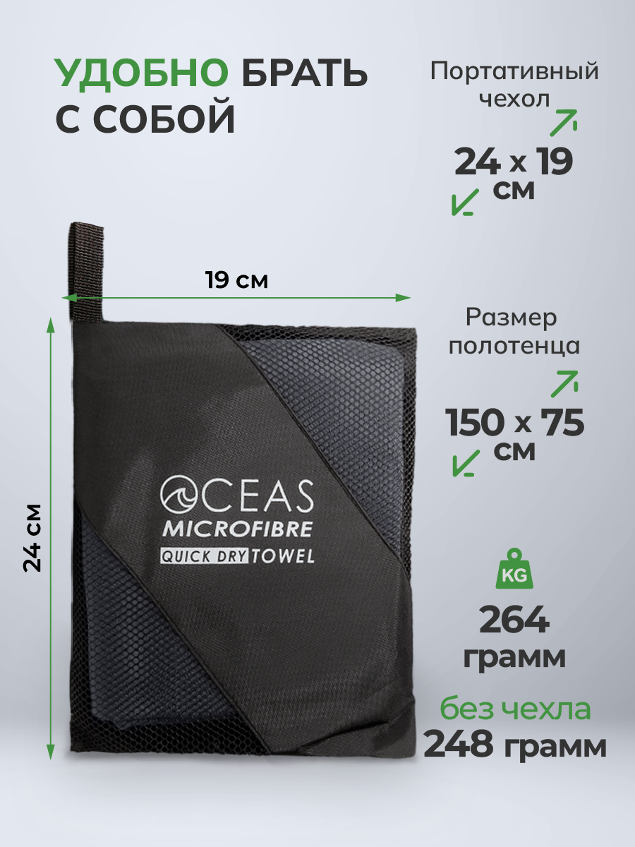 10 цен на Полотенце спортивное OCEAS из микрофибры , быстросохнущее для фитнеса и йоги, 150х75 см, тёмно-серый с зеленой строчкой