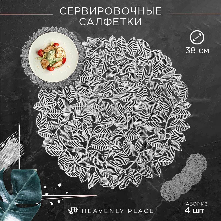 10 цен на Салфетки для сервировки стола Листья мяты серебро, 4 шт, круглые, диаметр 38 см. Подставка под тарелки сервировочные из ПВХ. Набор плейсматов