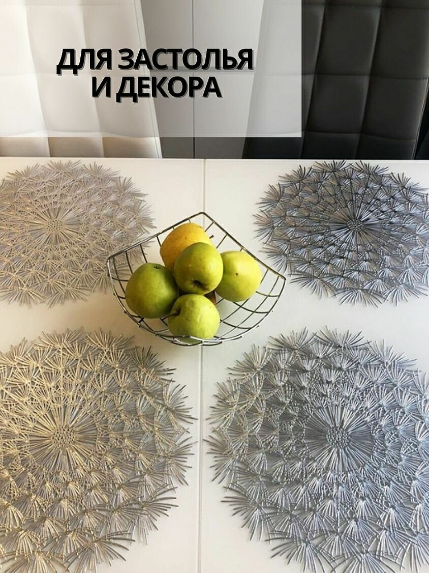 Отзывы на Салфетки для сервировки стола Одуванчик серебро, 4 шт, круглые, диаметр 38 см. Подставка под тарелки сервировочные из ПВХ. Набор плейсматов