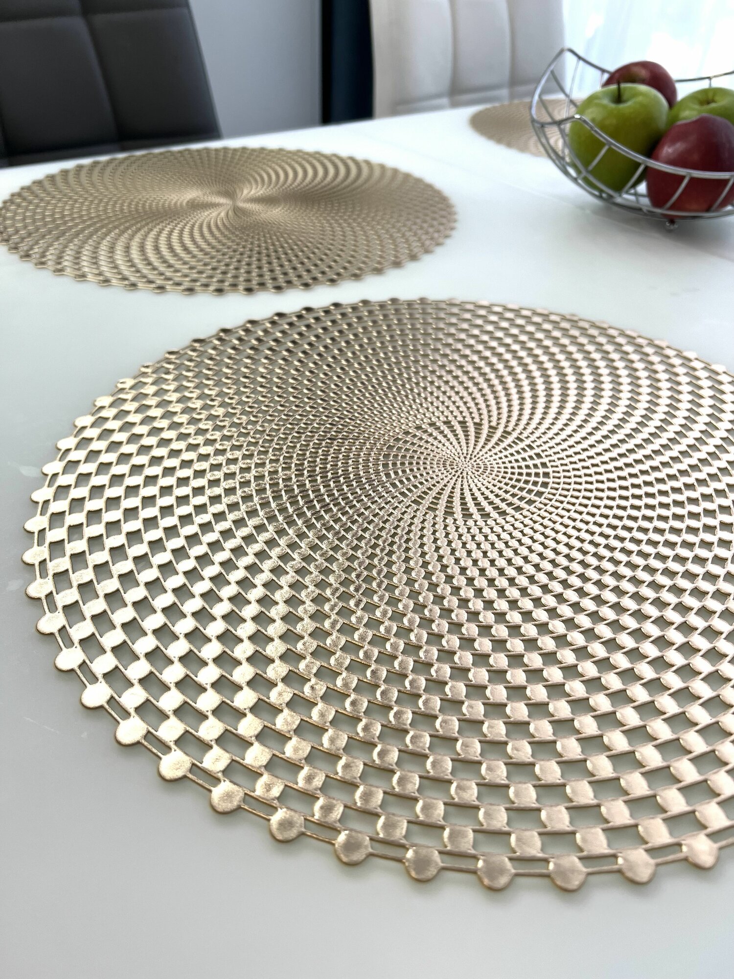 Отзывы на Салфетки для сервировки стола Воронка золото, 4 шт, круглые, диаметр 38 см. Подставка под тарелки сервировочные из ПВХ. Набор плейсматов