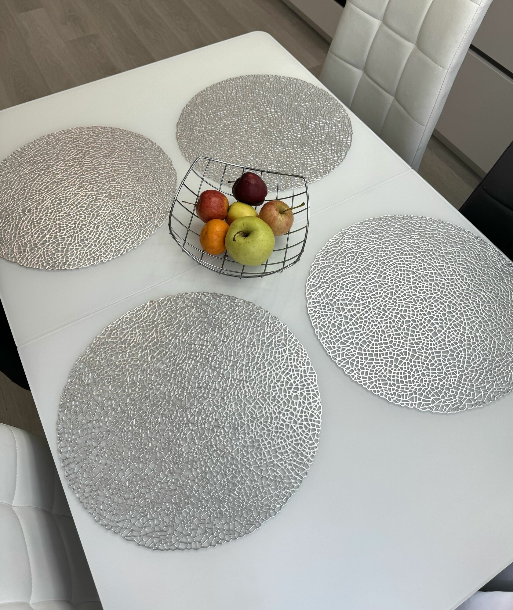 Отзывы на Салфетки для сервировки стола серебро, 4 шт, круглые, диаметр 38 см. Подставка под тарелки сервировочные из ПВХ. Набор плейсматов