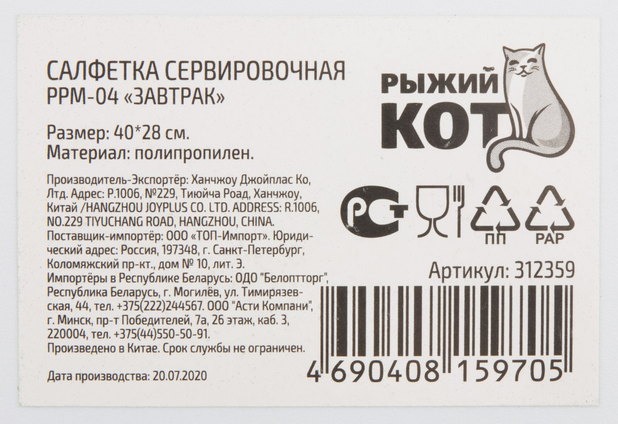 Отзывы на Салфетка сервировочная Завтрак, "Рыжий Кот" PPM-04, 40 х 28 см, материал: пластик