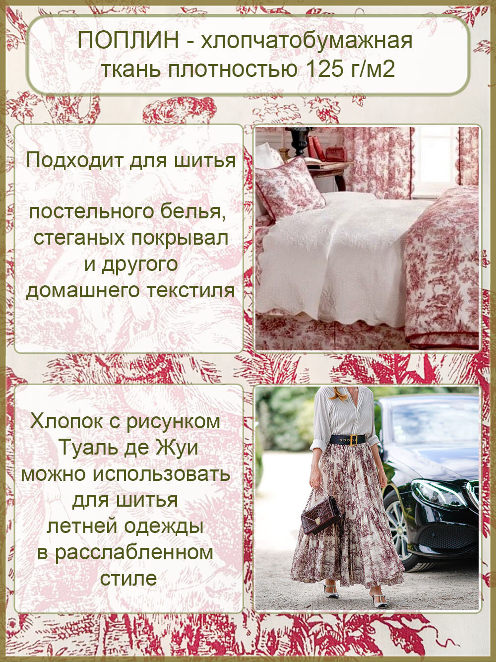 Отзывы на Ткань для шитья, 100 % хлопок поплин Турция, рисунок Туаль де Жуи брусничный, 1 м х 240 см