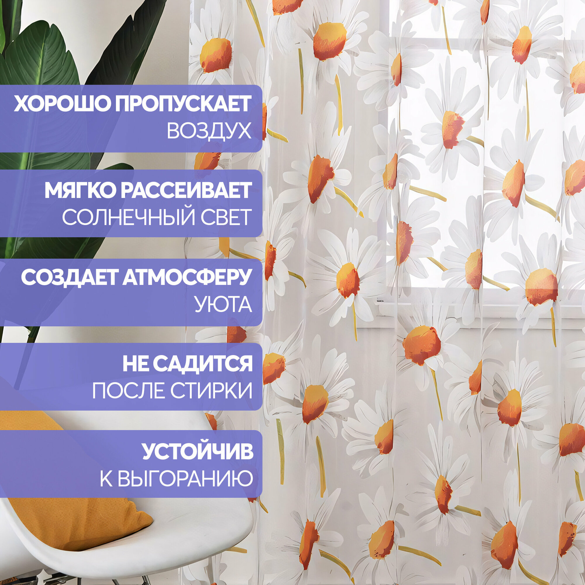 Отзывы на Тюль с ромашками цветная белая 100х250 см, вуаль для зала, спальни, кухни, длинная органза, занавески под лен