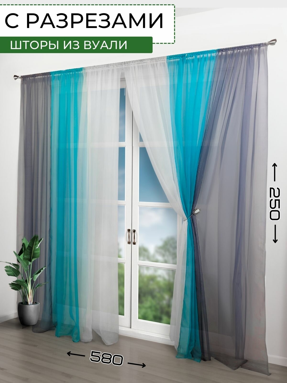 Шторы для комнаты с разрезами вуаль Домтекс35 "Радуга" бирюзовый/светло-серый/белый, высота 250см 3 100 ₽