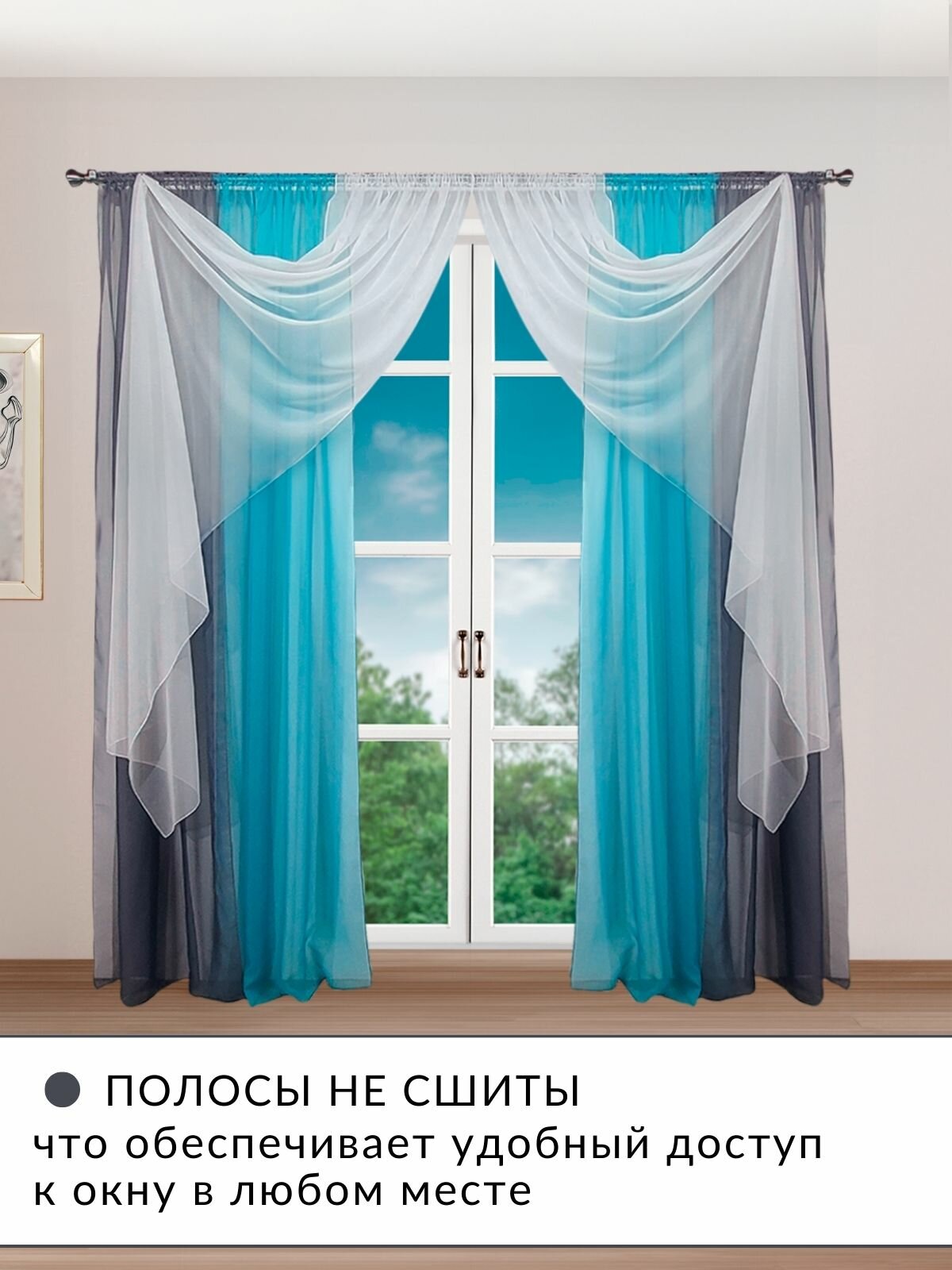Отзывы на Шторы для комнаты комплект тюль вуаль "Радуга" графит/бирюзовый, высота 250см