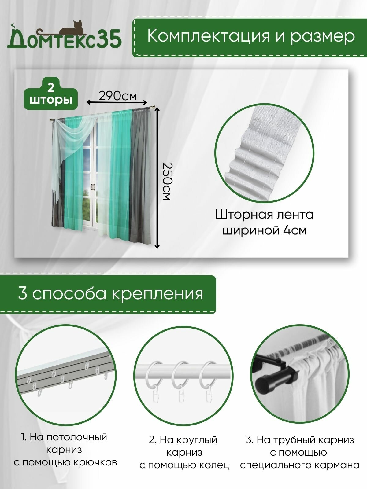 Отзывы на Шторы для комнаты с разрезами вуаль Домтекс35 "Радуга" зеленая мята/графит/белый, высота 250см