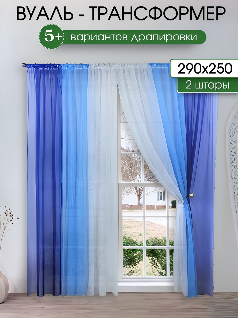 10 цен на Шторы для комнаты комплект тюль вуаль "Радуга" синий/голубой, высота 250см