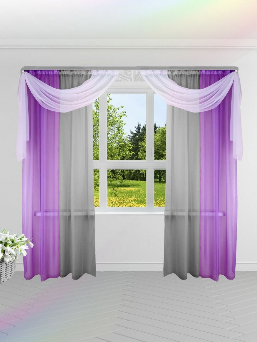 Отзывы на Шторы для комнаты комплект тюль вуаль "Радуга" сиреневый/серый, высота 250см
