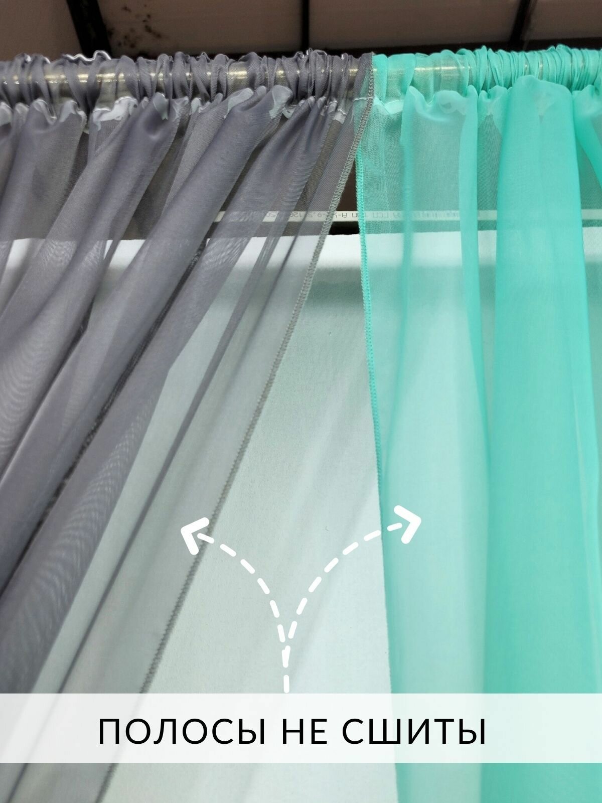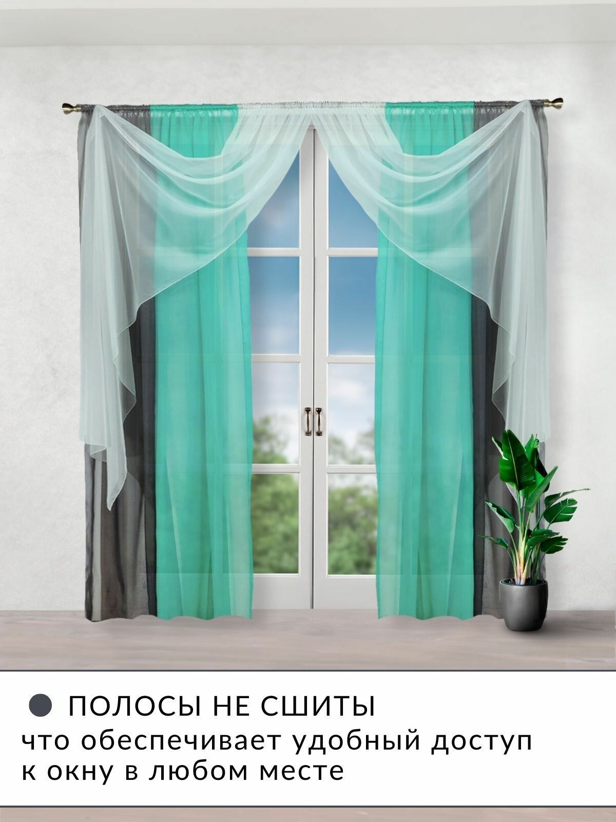Шторы для комнаты с разрезами вуаль Домтекс35 "Радуга" зеленая мята/графит/белый, высота 250см 3 100 ₽