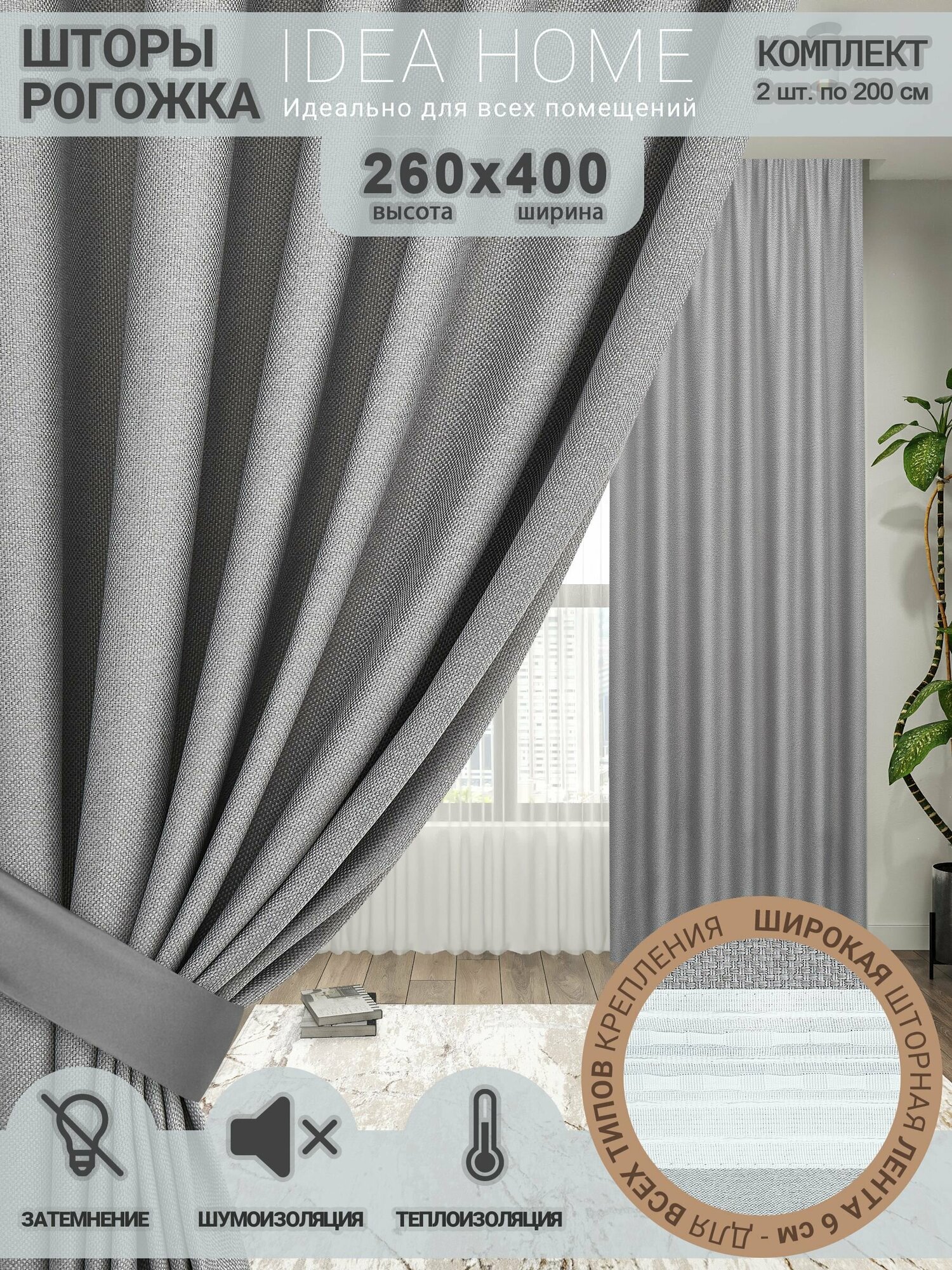 Комплект штор блэкаут 400х260 2 шт по 200 см , IDEA HOME / затемнение более 90% , рогожка однотонный светло-серый информация: