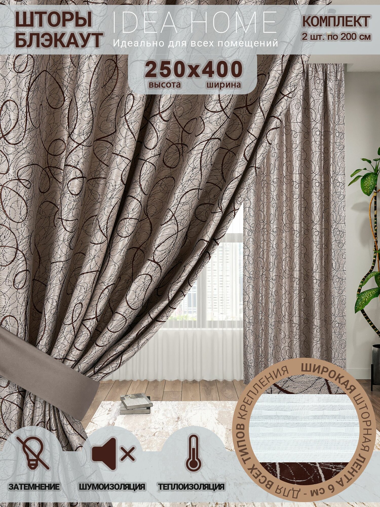 Комплект штор из 2 шт, по 200 см блэкаут/ blackout IDEA HOME светозащитные для комнаты , кухни , спальни , гостиной и дачи 400*250 см , двусторонние , бежево-коричневые