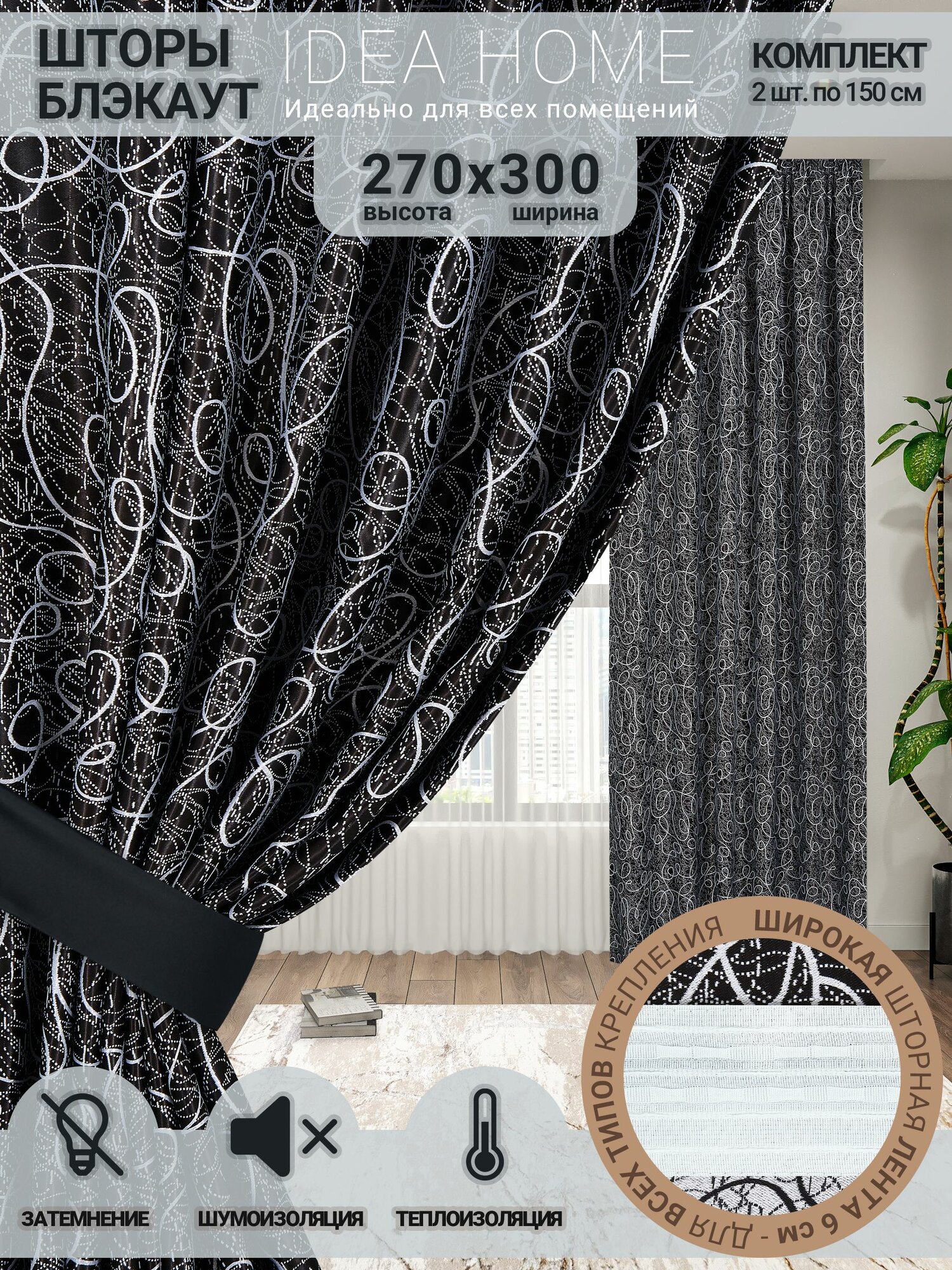 Комплект штор из 2 шт по 150 см блэкаут/ blackout IDEA HOME светозащитные для комнаты , кухни , спальни , гостиной и дачи 300*270 см , узор черный, паутинка информация: