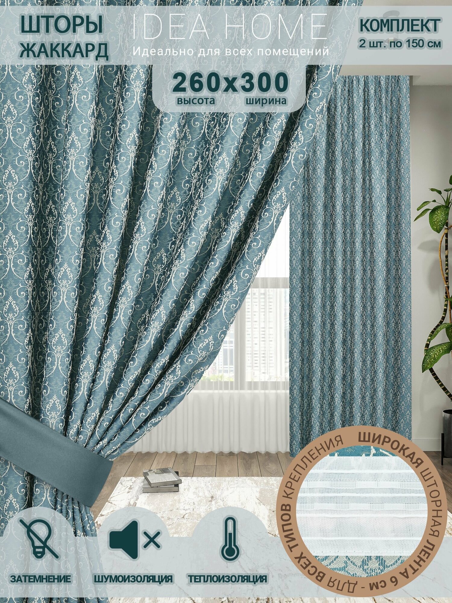 Шторы комнатные IDEA HOME/комплект из 2 шт по 150 см/ портьеры для комнаты, кухни, спальни, гостиной и дачи 260х300см/ французский жаккард/ бирюзовый информация: