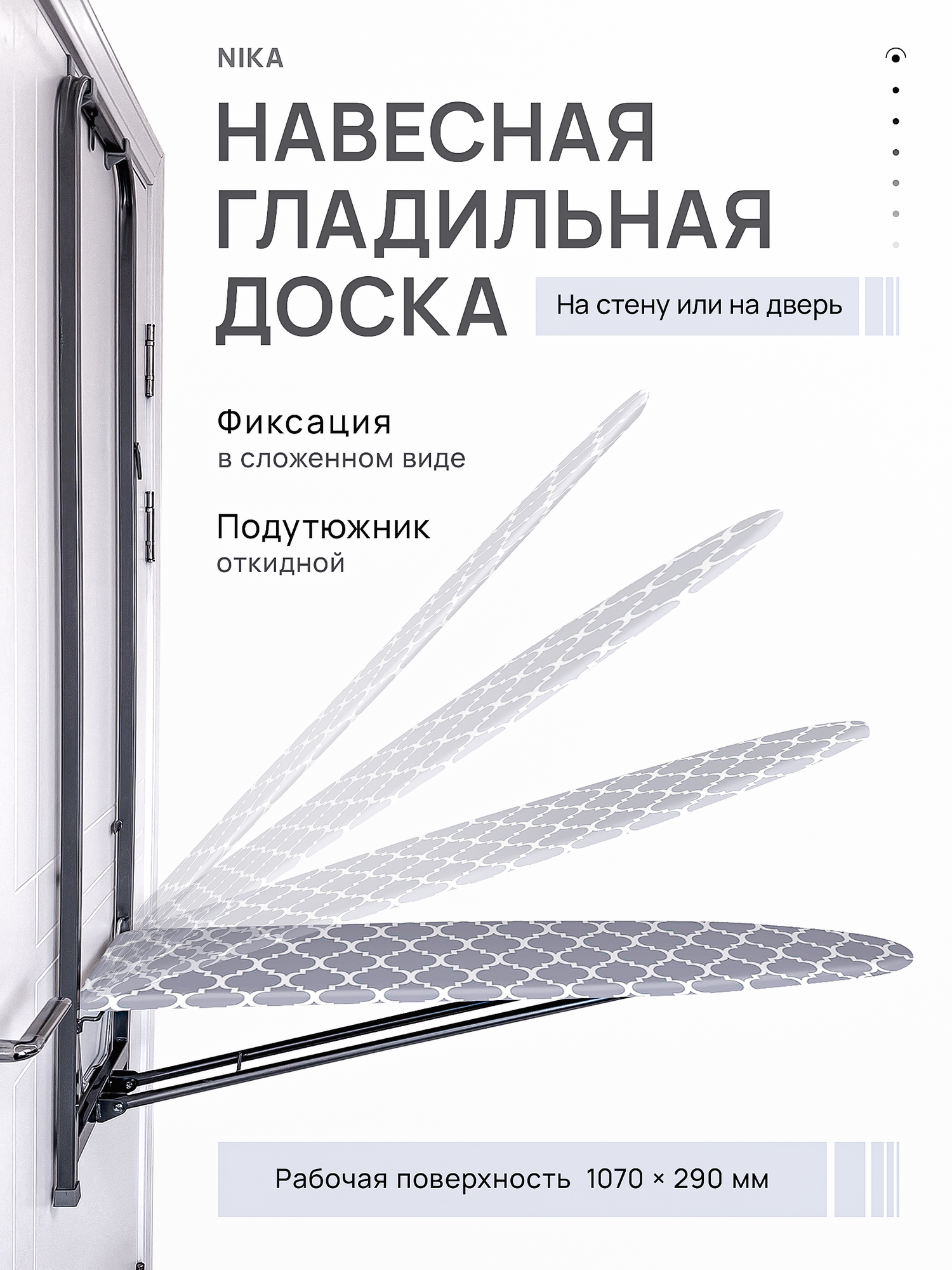 Гладильная доска Nika ДН1, навесная, на дверь, с креплениями, 107x29 см складная информация: