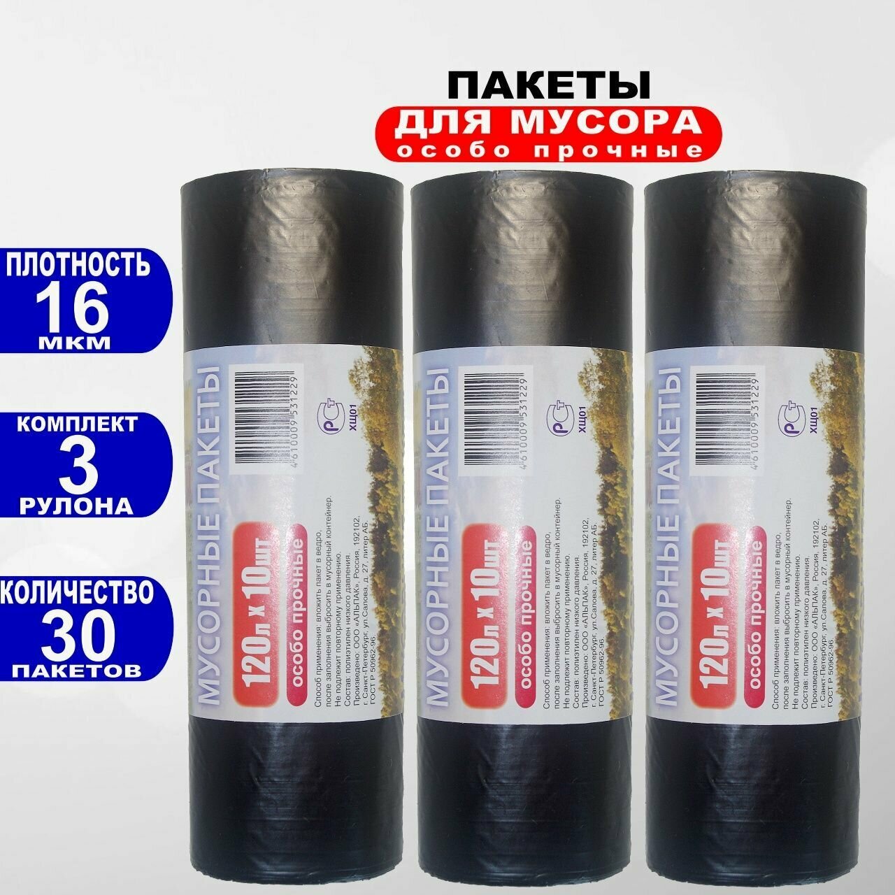 10 цен на Мусорные пакеты "мандаринка" 120 л по 10 шт, особо прочные, 16 мкм, 3 рулона, 30 шт, чёрные