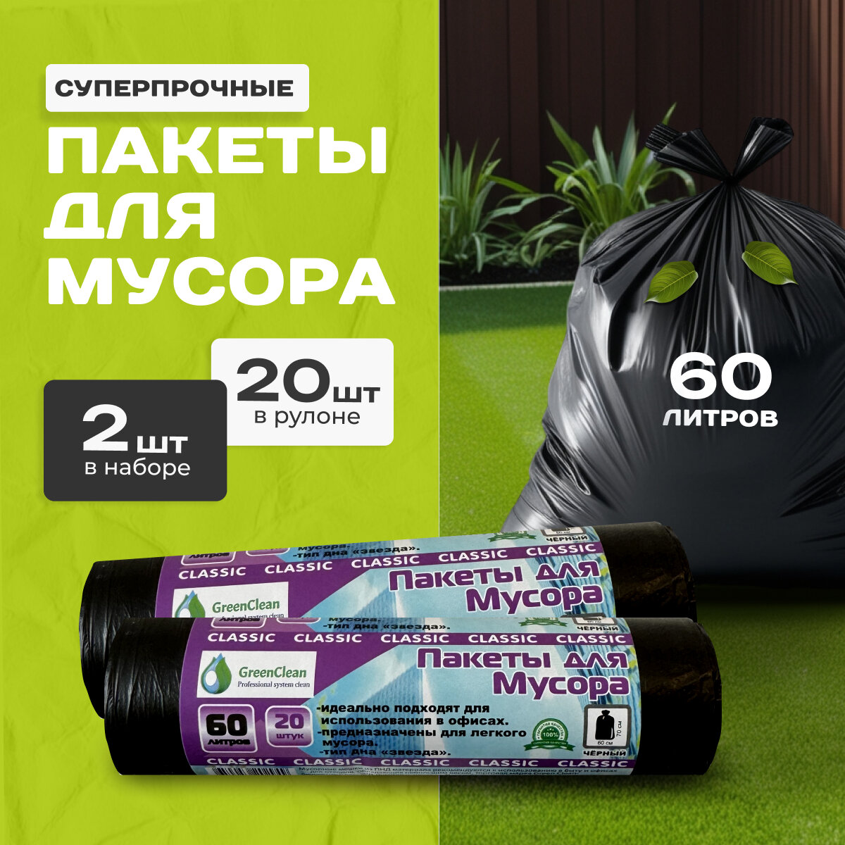 Мешки для Мусора Green Clean Classic 60 л 40 шт, Черные информация: