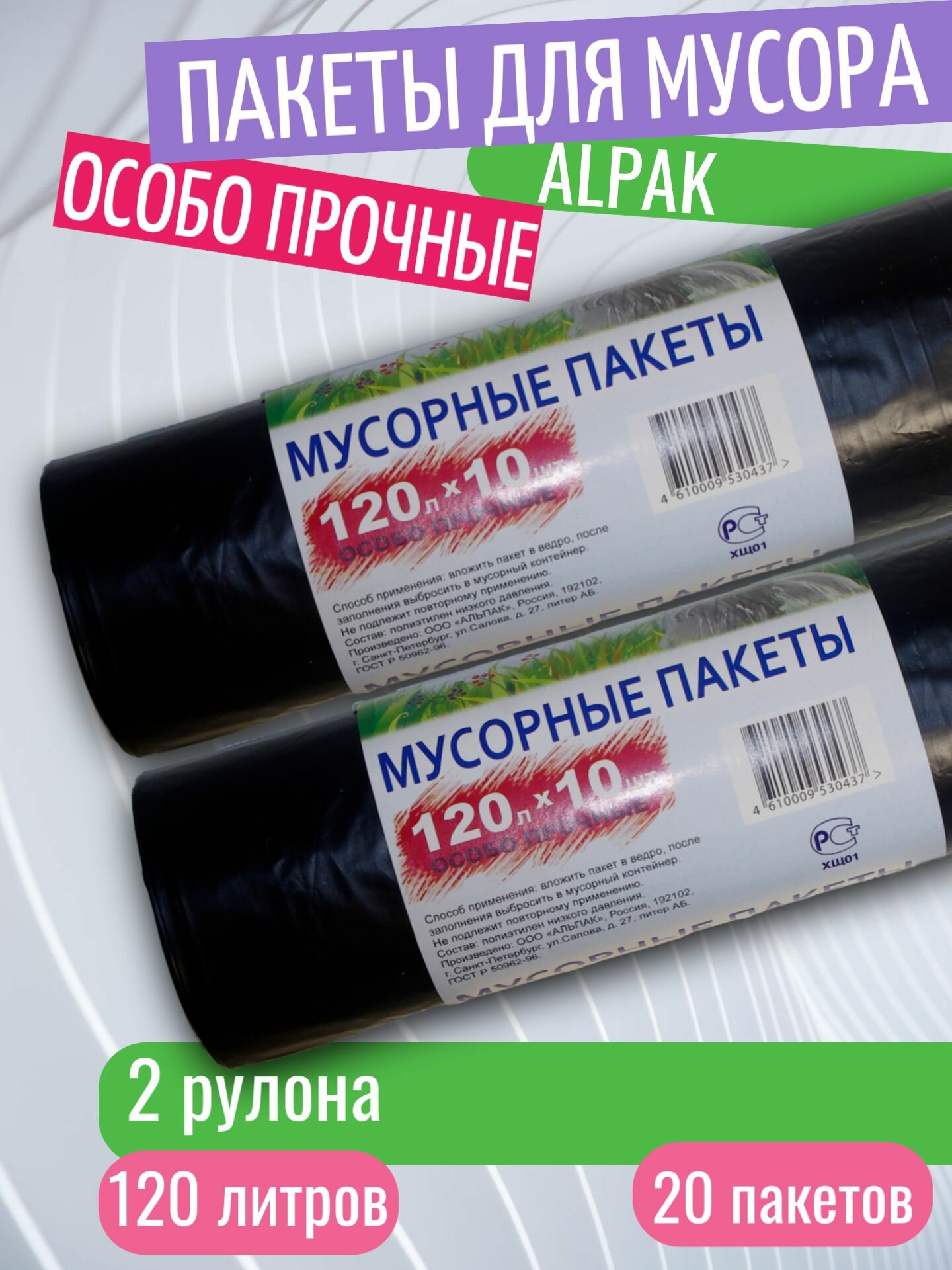 Пакеты для мусора "альпак" 120л по 10шт, Особо Прочные, 20 мкм, 2 рулона 20 шт, чёрные информация: