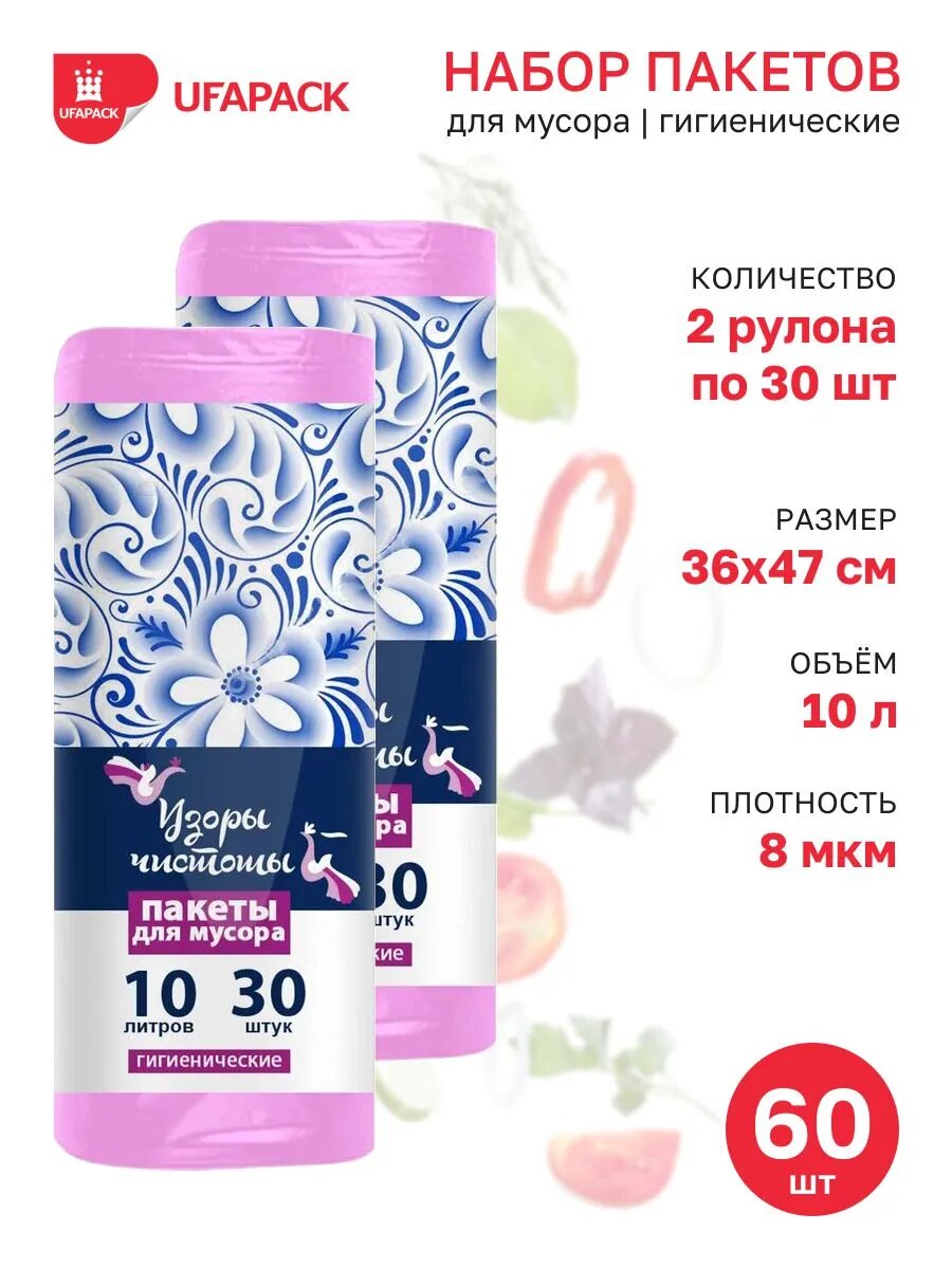Мусорные пакеты "Узоры Чистоты", гигиенические, полиэтилен, розовые, 10 литров, 60 штук ,8 мкм, UFAPACK информация: