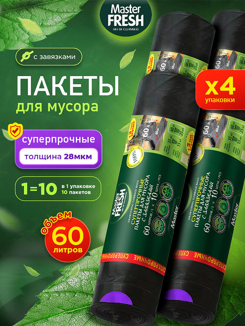 Отзывы на Пакеты для мусора Master Fresh с завязками суперпрочные черные 28мкм усиленное дно 60л 10шт*4шт