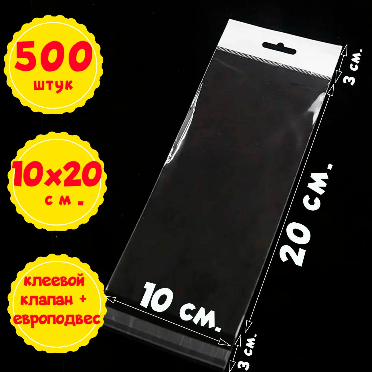500 пакетов 10х20+6 см с белым европодвесом и клеевым клапаном упаковочных информация: