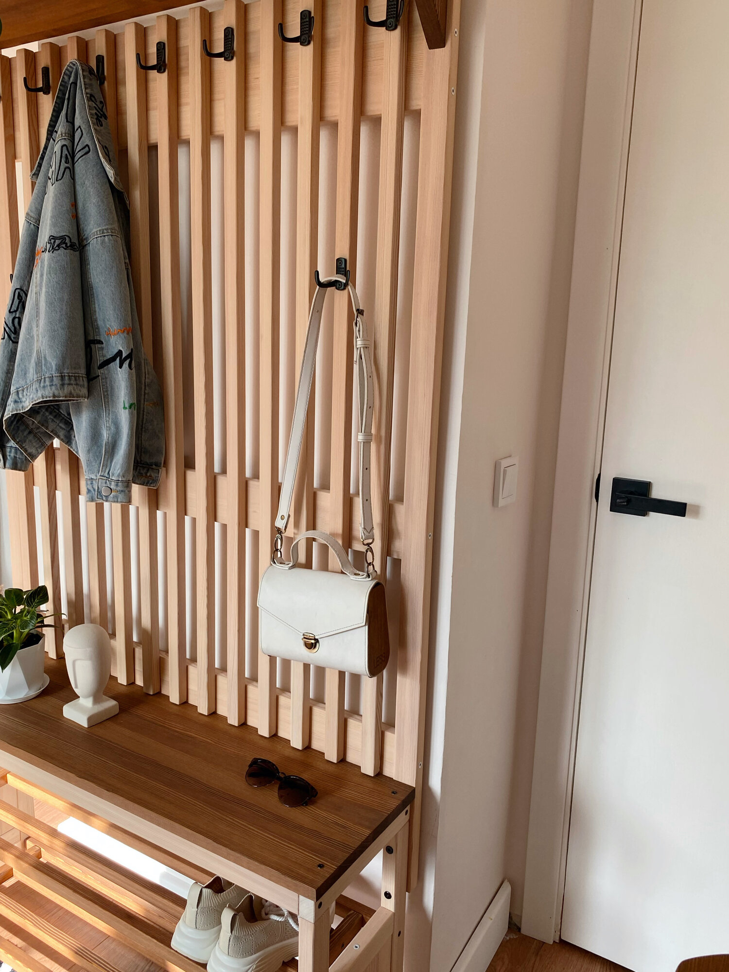 Отзывы на Комплект в прихожую, деревянная вешалка с обувницей, прихожая из массива Лиственницы 185х105х30, цвет Белый, Орех