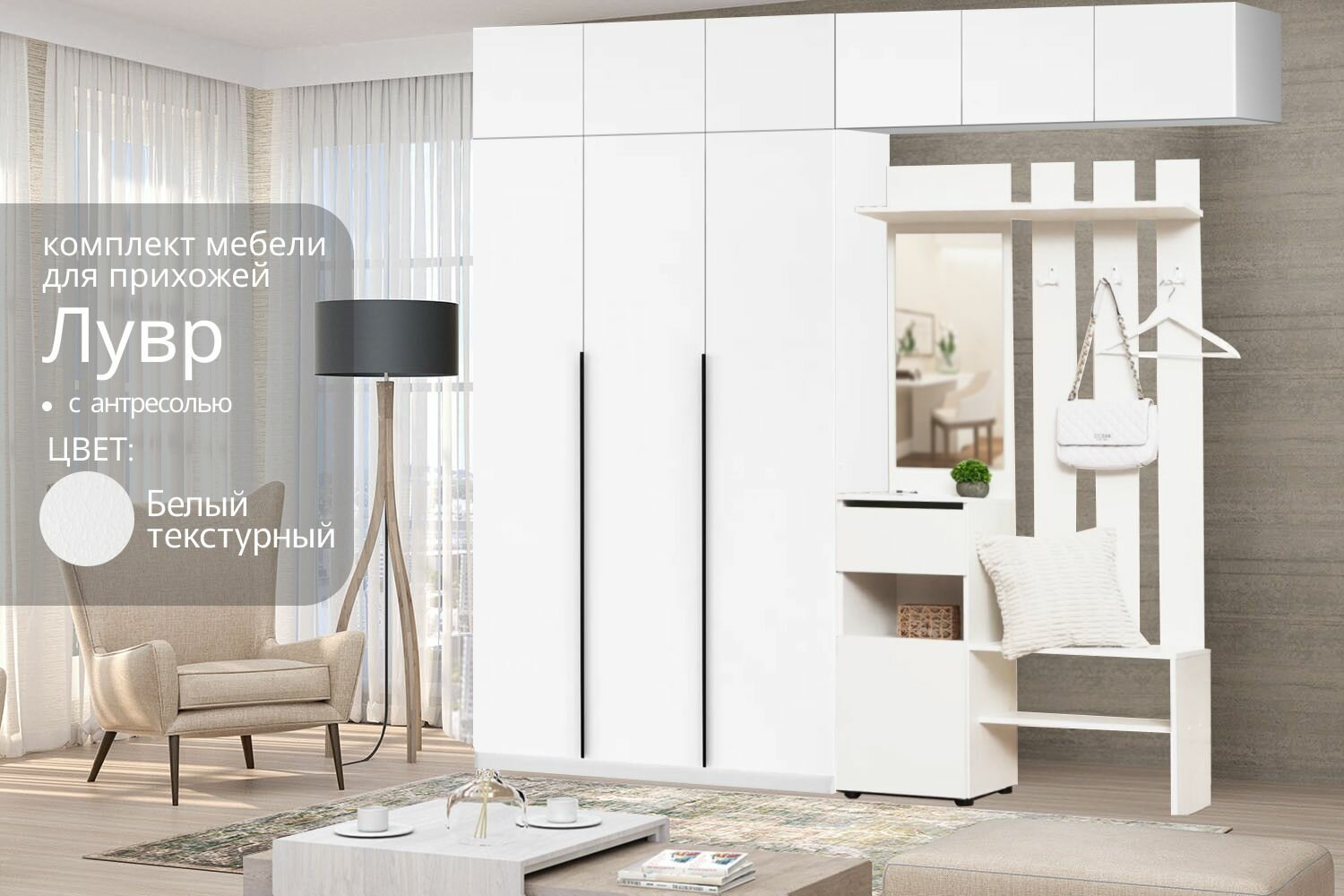 Модульная прихожая Лувр белый текстурный, с 11-ю полками и антресолью 240.2х50.6х260 см информация: