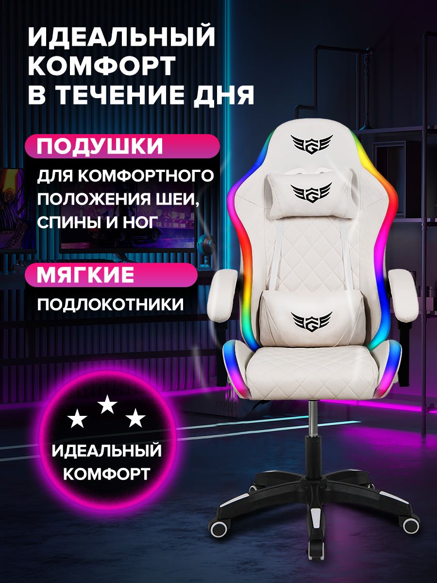 10 цен на FONLUXX 507 RGB- белый, Игровое компьютерное кресло с подголовником, металлический каркас, Кожаные подлокотники, регулируемая спинка