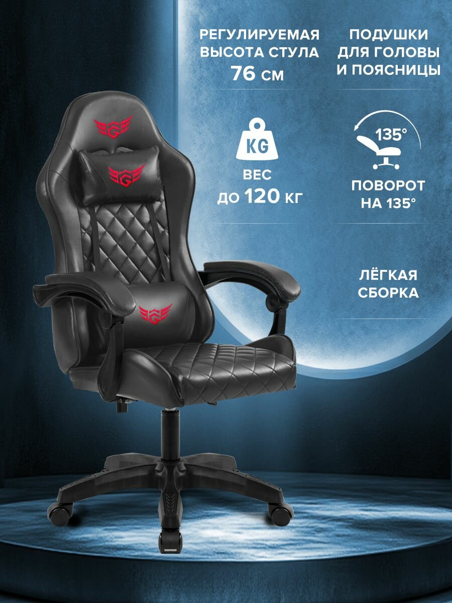 Кресло компьютерное, офисное, FONLUXX 507-черный, Игровое компьютерное кресло с подголовником, металлический каркас, Кожаные подлокотники информация: