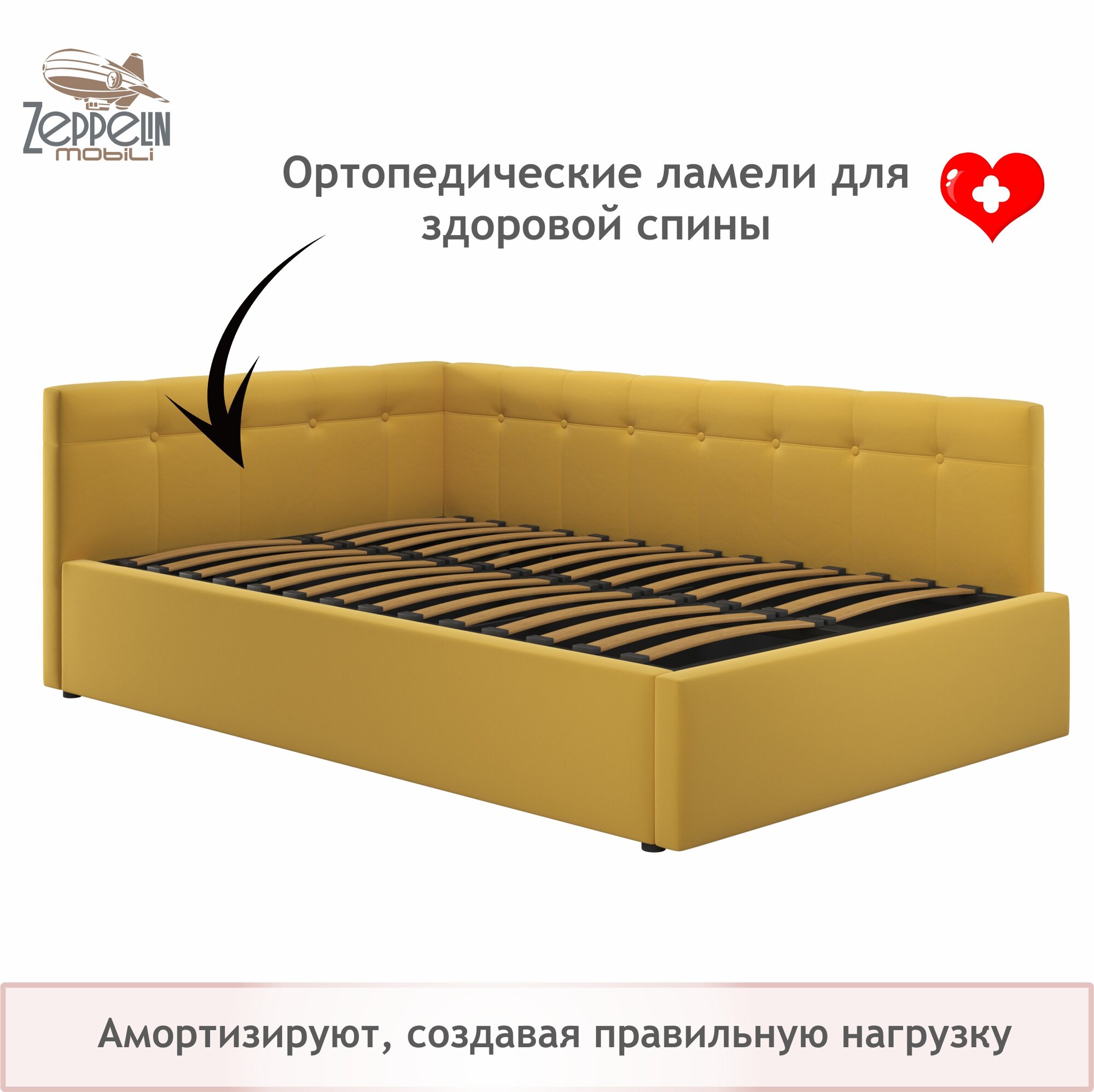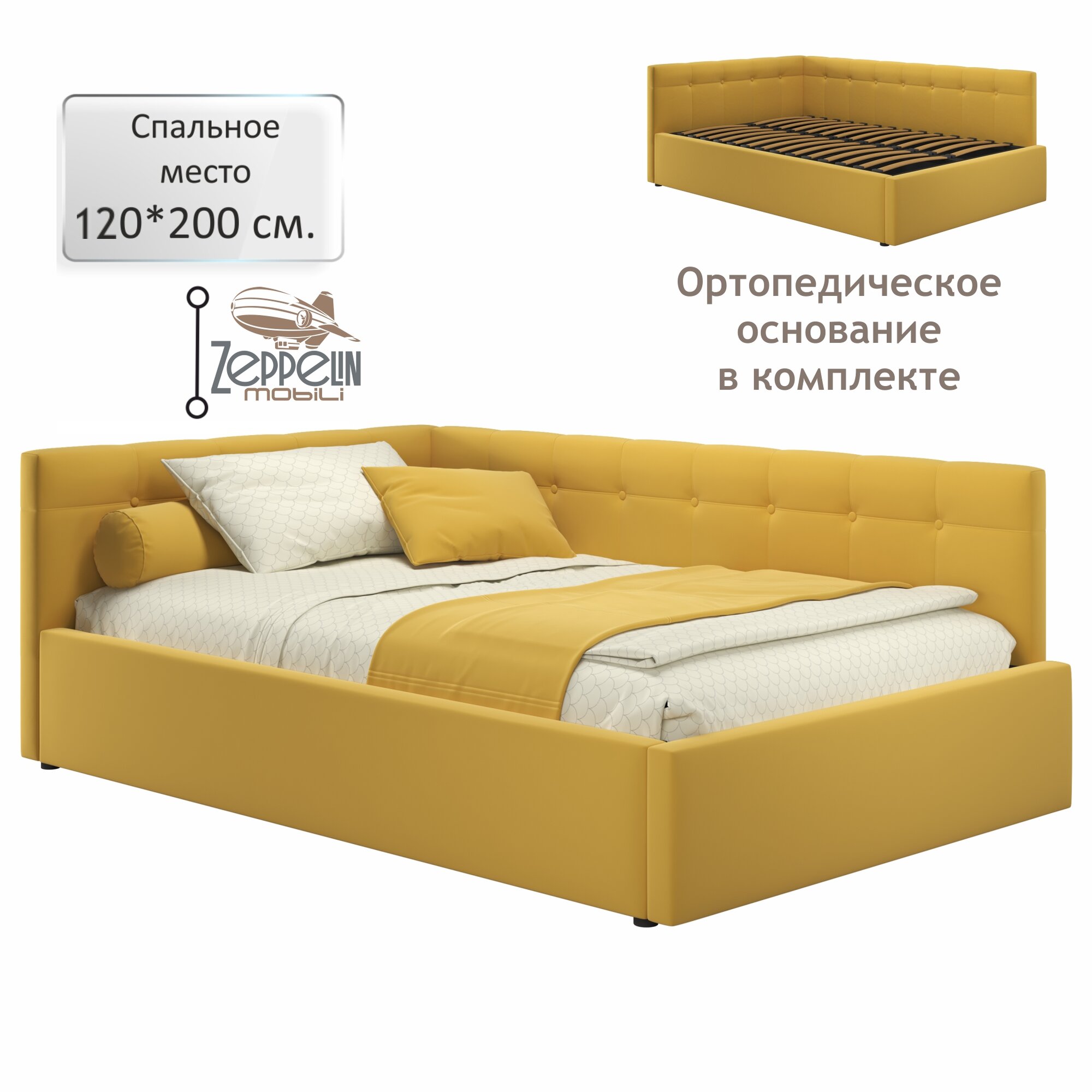 Кровать-тахта угловая Bonna 120х200 желтая ортопедическая, мягкая спинка из велюра, с ламелями информация: