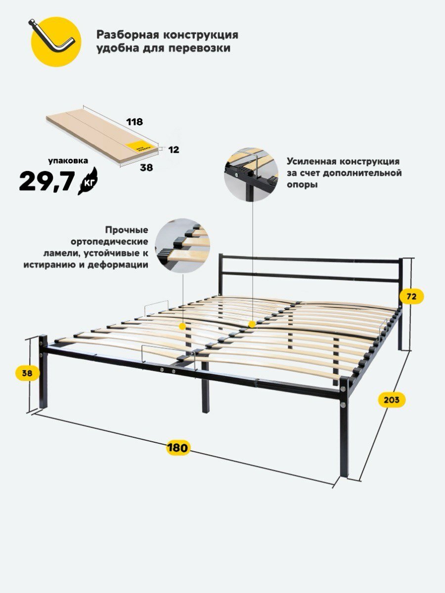 Кровать двуспальная 180х200 металлическая Танго, с ортопедическим основанием, цвет черный информация: