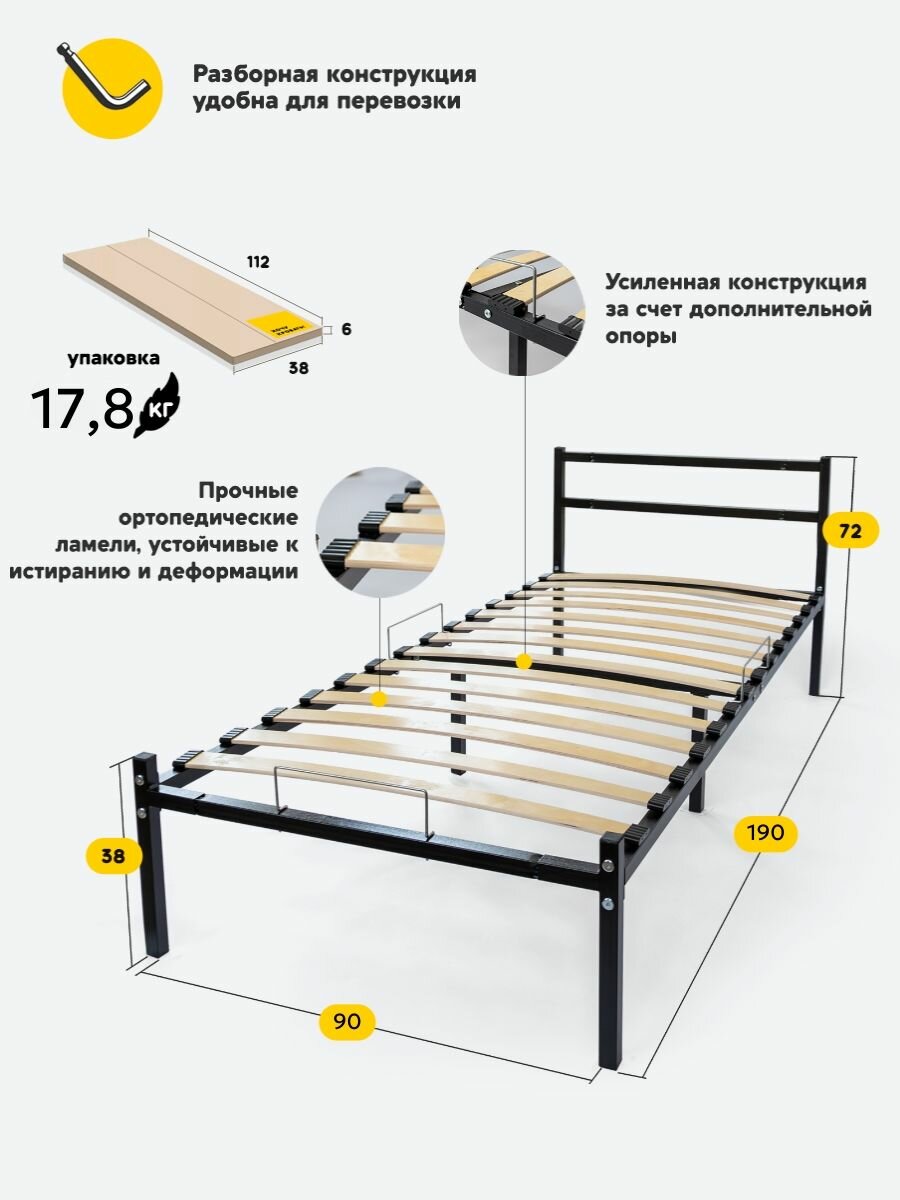 Кровать односпальная 90х190 металлическая Зумба, с ортопедическим основанием, с изголовьем, черная информация: