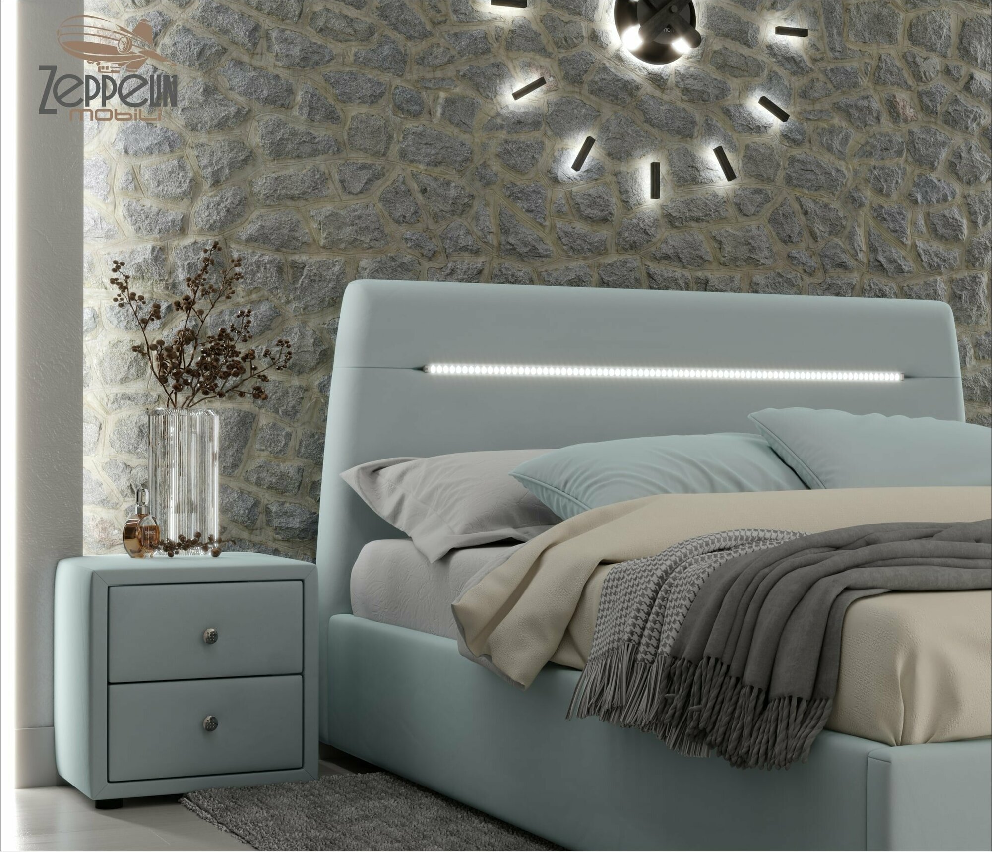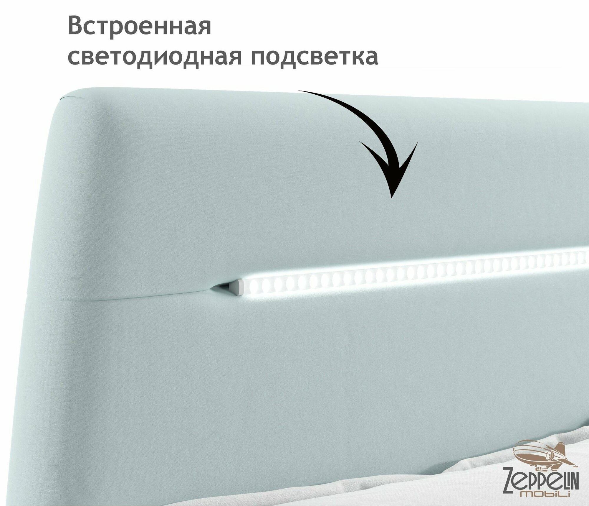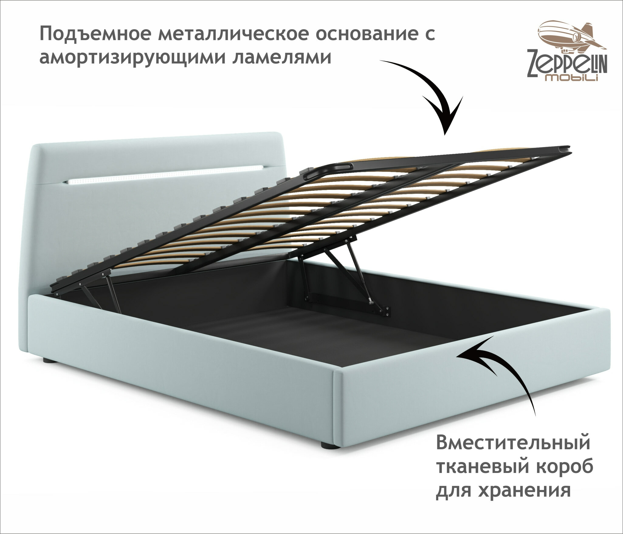 Кровать с подсветкой NEO 160х200 Zeppelin Mobili подъемная из велюра мятная, с ортопедическими ламелями, с ящиком для хранения информация: