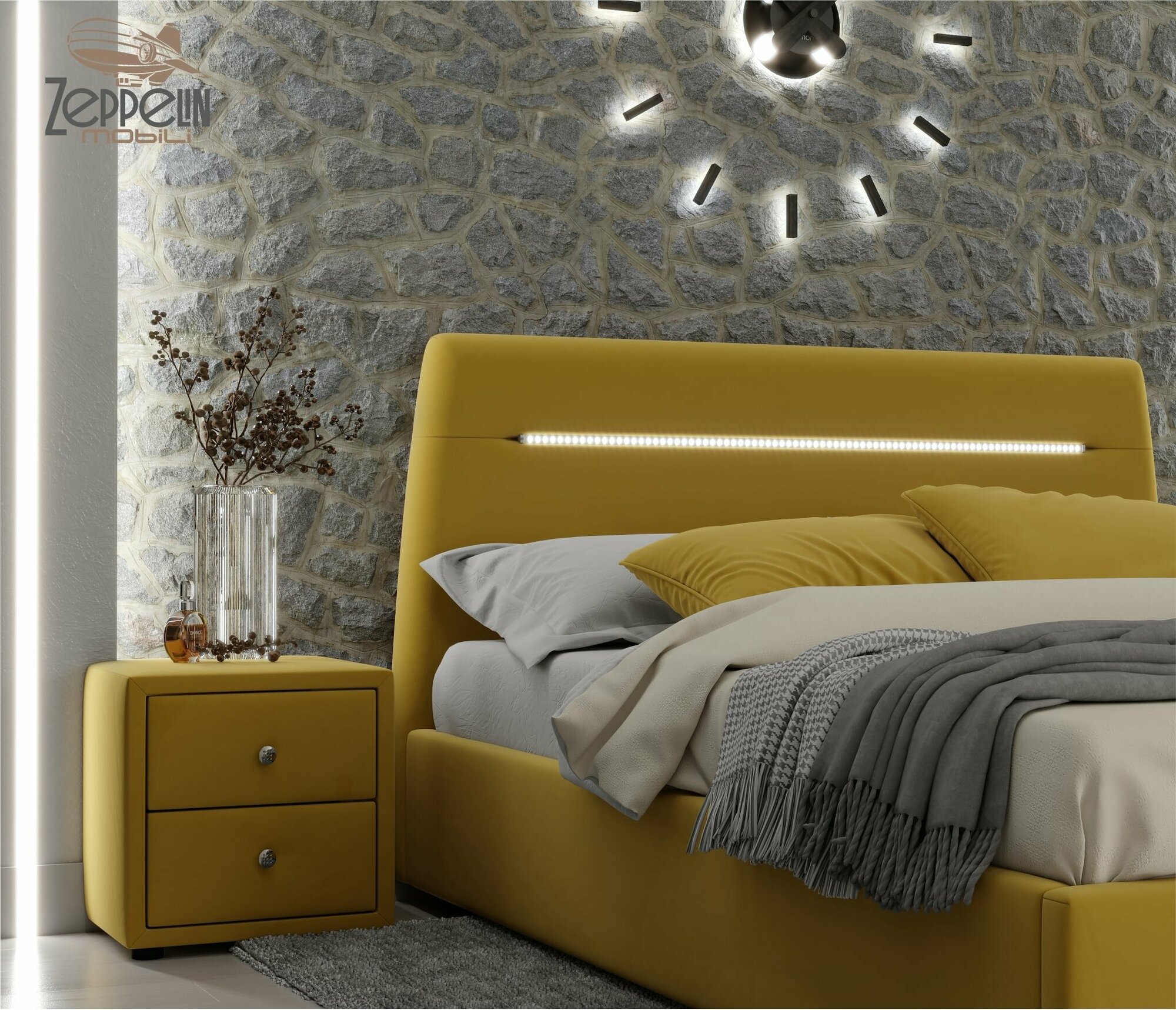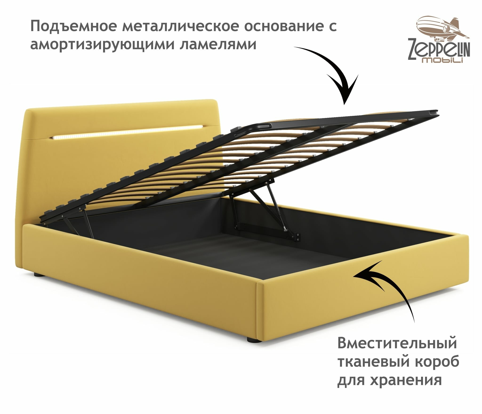 Кровать с подсветкой NEO 160х200 Zeppelin Mobili подъемная из велюра желтая, с ортопедическими ламелями, с ящиком для хранения информация: