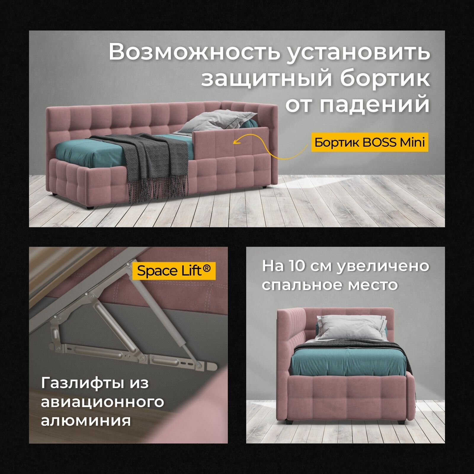 Отзывы на Односпальная кровать BOSS mini, с подъемным механизмом, велюр Monolit роуз, спальное место 90х200 см