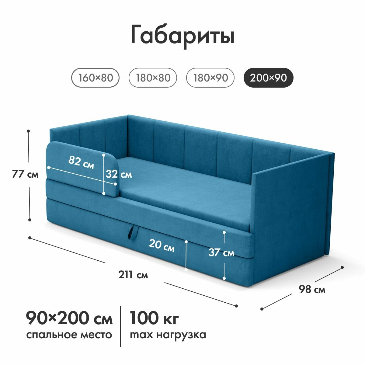 Детский диван кровать Челси 90х200 см морская волна с матрасом, чехлом, выкатным ящиком и бортиком Кровать детская от 3х лет информация: