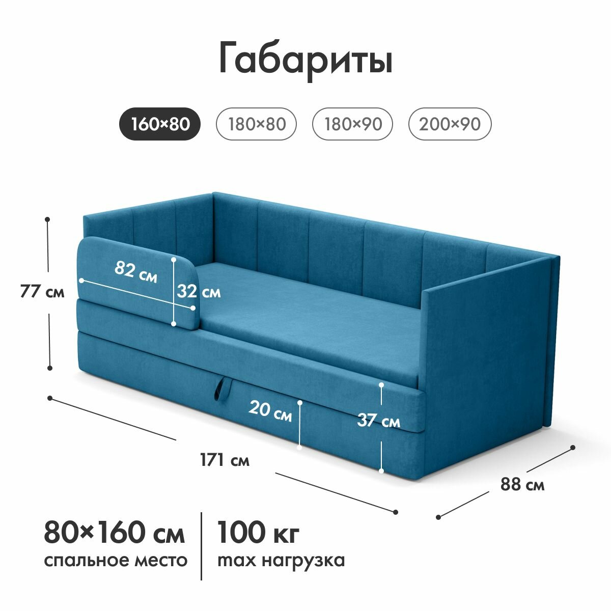 Детский диван кровать Челси 160х80 см морская волна с матрасом, чехлом, выкатным ящиком и бортиком Кровать детская от 3х лет информация: