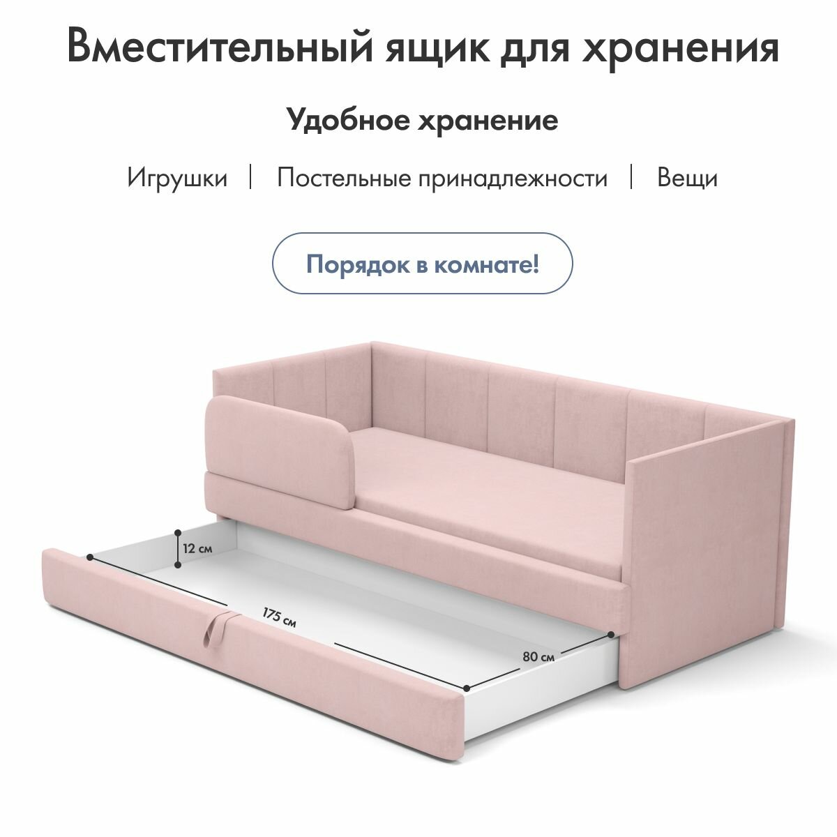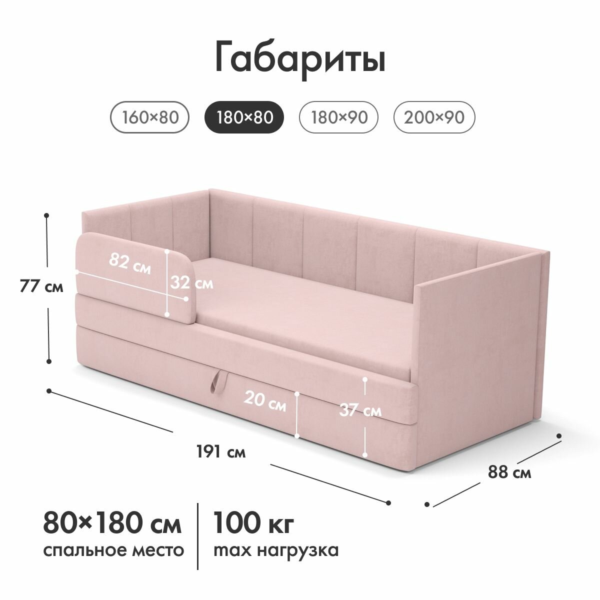 Детский диван кровать Челси 180х80 см розовый с матрасом, чехлом, выкатным ящиком и бортиком Кровать детская от 3х лет информация: