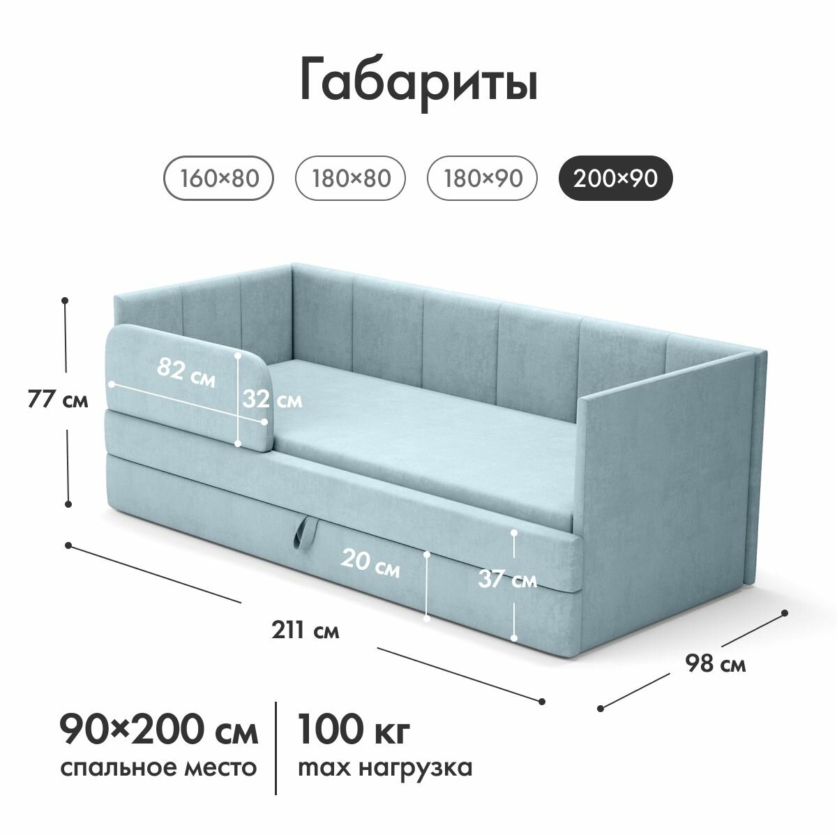 10 цен на Детский диван кровать Челси 90х200 см голубой с матрасом, чехлом, выкатным ящиком и бортиком Кровать детская от 3х лет