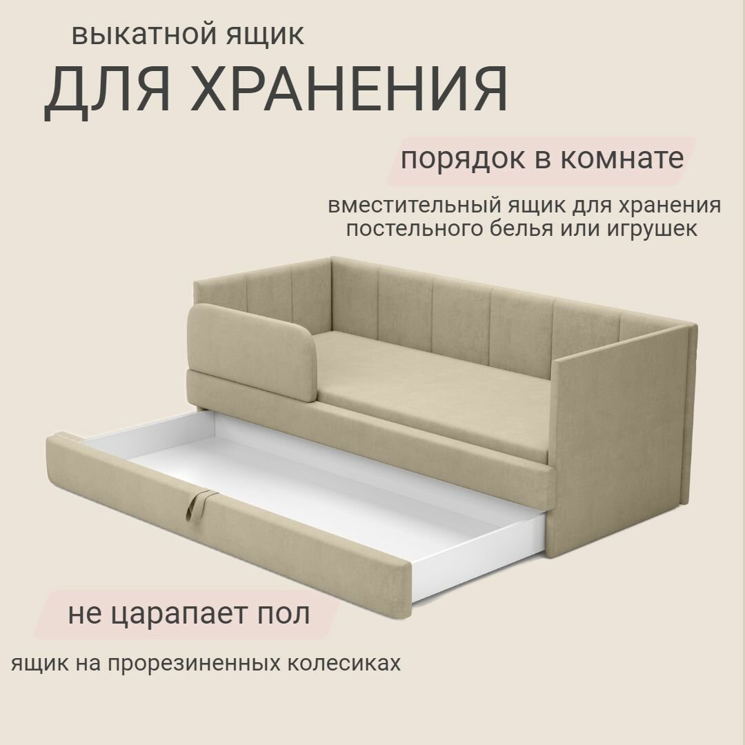 10 цен на Детский диван кровать Челси 180х80 см бежевый с матрасом, чехлом, выкатным ящиком и бортиком Кровать детская от 3х лет