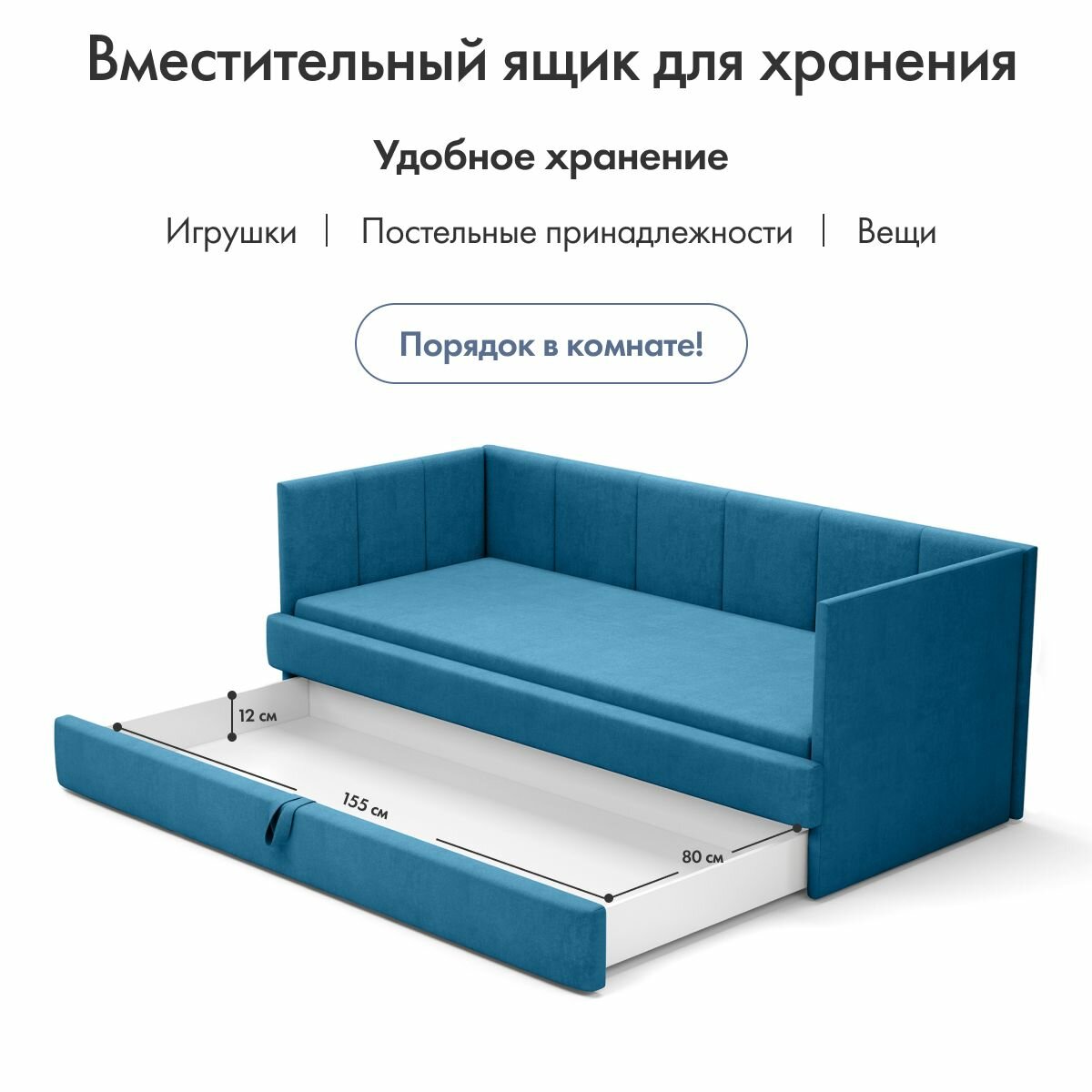 Детский диван кровать Челси 160х80 см морская волна с матрасом, чехлом и выкатным ящиком Кровать детская от 3х лет информация: