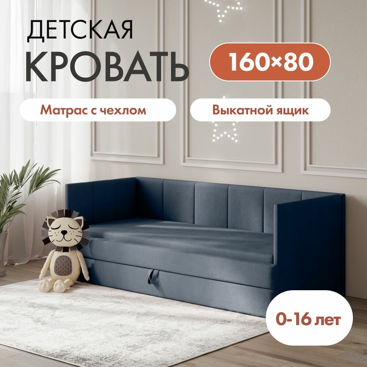 Отзывы на Детский диван кровать Челси 160х80 см графитовый с матрасом, чехлом и выкатным ящиком Кровать детская от 3х лет