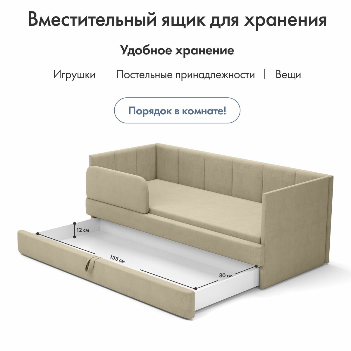 10 цен на Детский диван кровать Челси 160х80 см бежевый с матрасом, чехлом, выкатным ящиком и бортиком Кровать детская от 3х лет