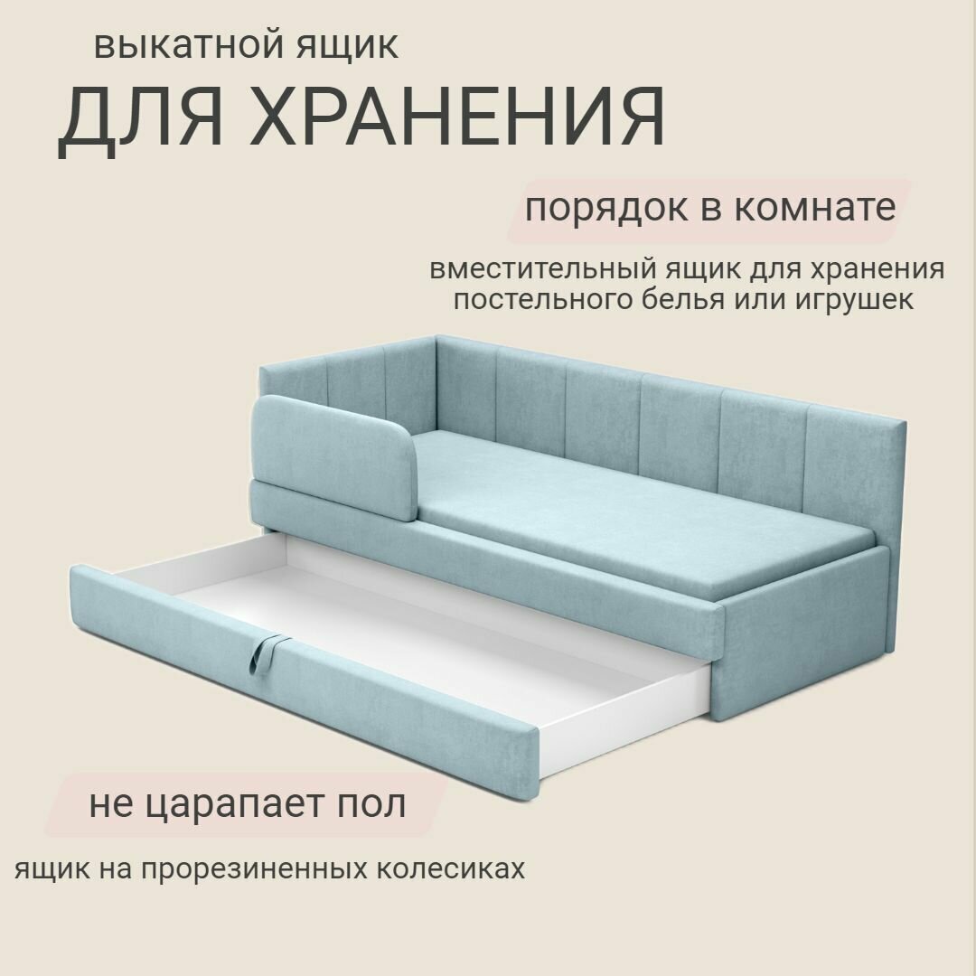 Детский диван кровать Челси Лайт 180х80 см морская волна с матрасом, чехлом, выкатным ящиком и бортиком Кровать детская от 3х лет 36 530 ₽