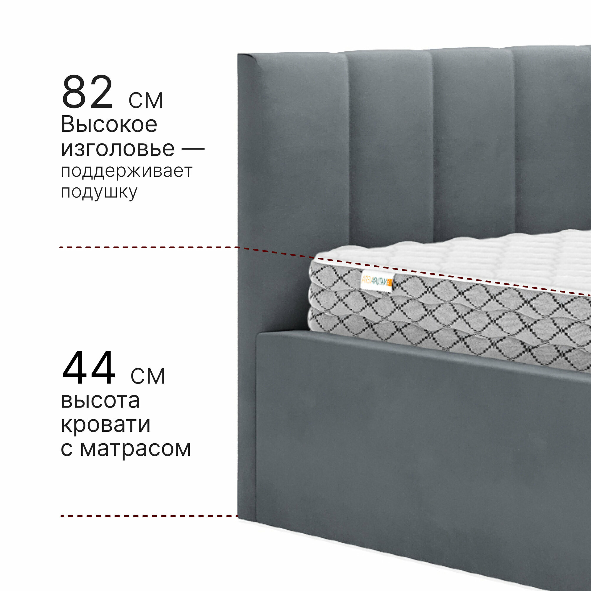 Кровать 90х200 + матрас, c подъемным механизмом и ящиком для белья Mia, велюр, темно-серый информация: