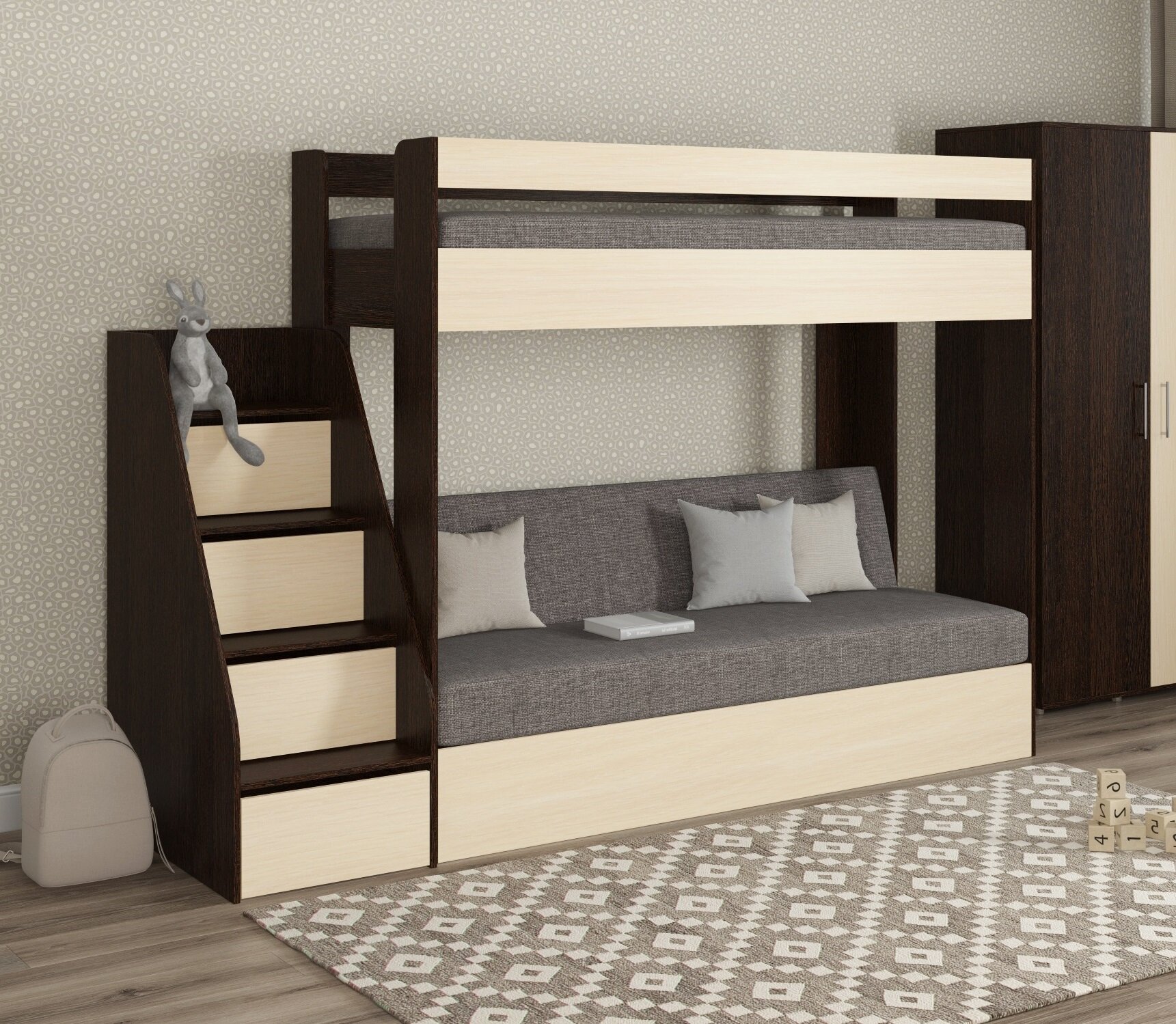 Кровать двухъярусная с диваном и лестницей-комодом Есэндвич Лаворо (Анкор темный/Анкор светлый/Savana Hazel) 56 890 ₽