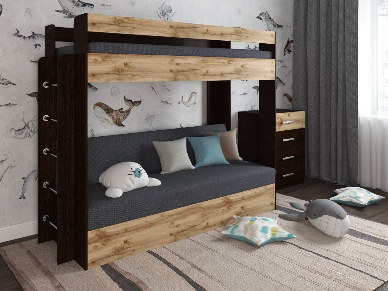 Отзывы на Кровать двухъярусная с диваном Есэндвич Лаворо (Венге/Дуб вотан/Savana Grey)