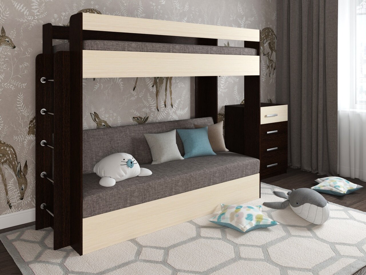Кровать двухъярусная с диваном Есэндвич Лаворо (Анкор темный/Анкор светлый/Savana Hazel) 42 390 ₽