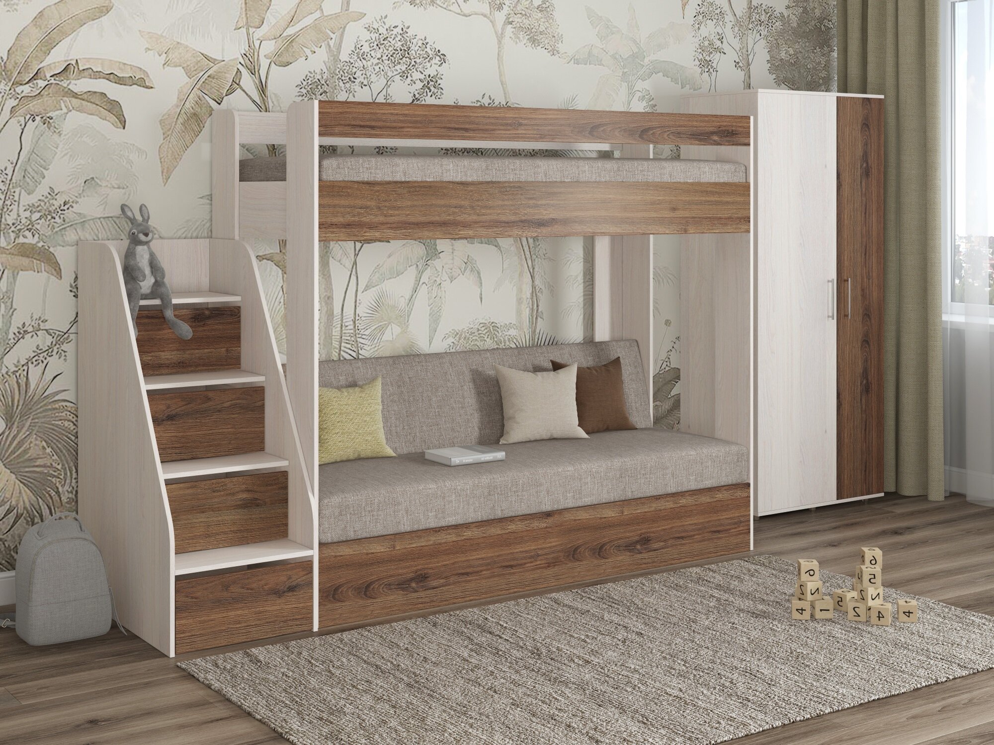 Кровать двухъярусная с диваном и лестницей-комодом Есэндвич Лаворо (Анкор темный/Анкор светлый/Savana Hazel) 56 890 ₽